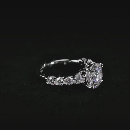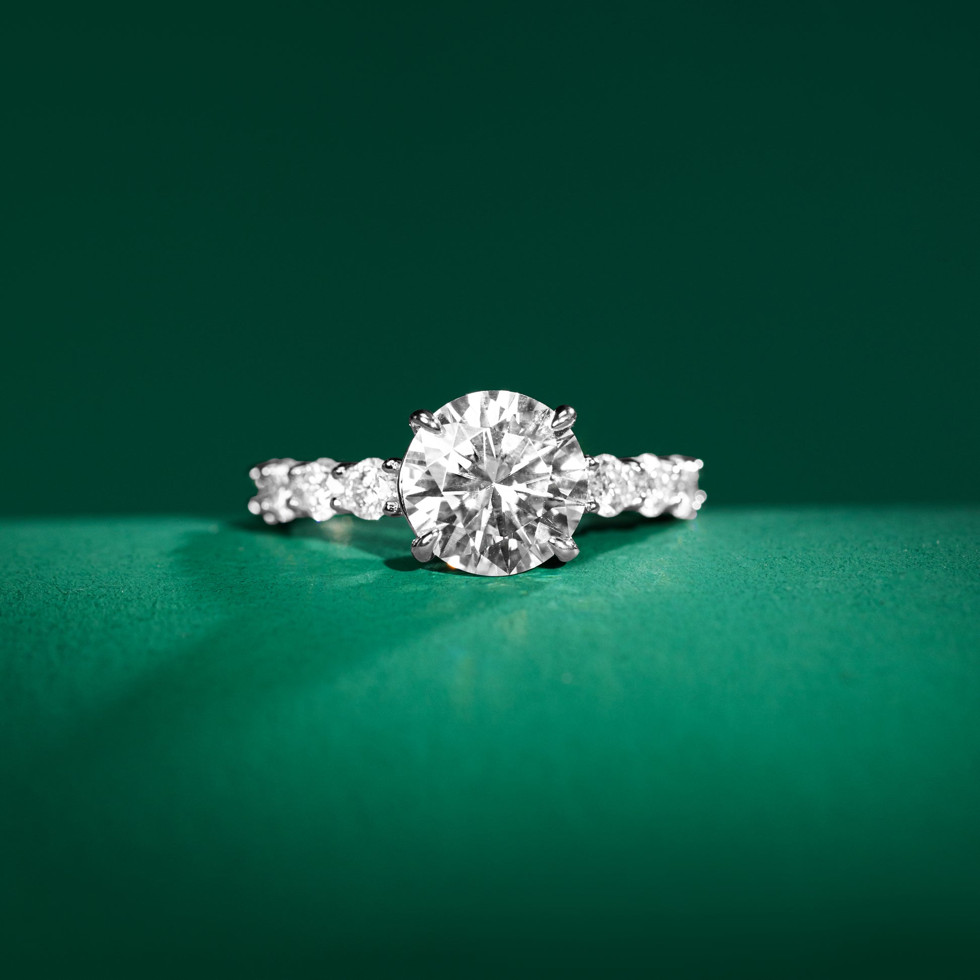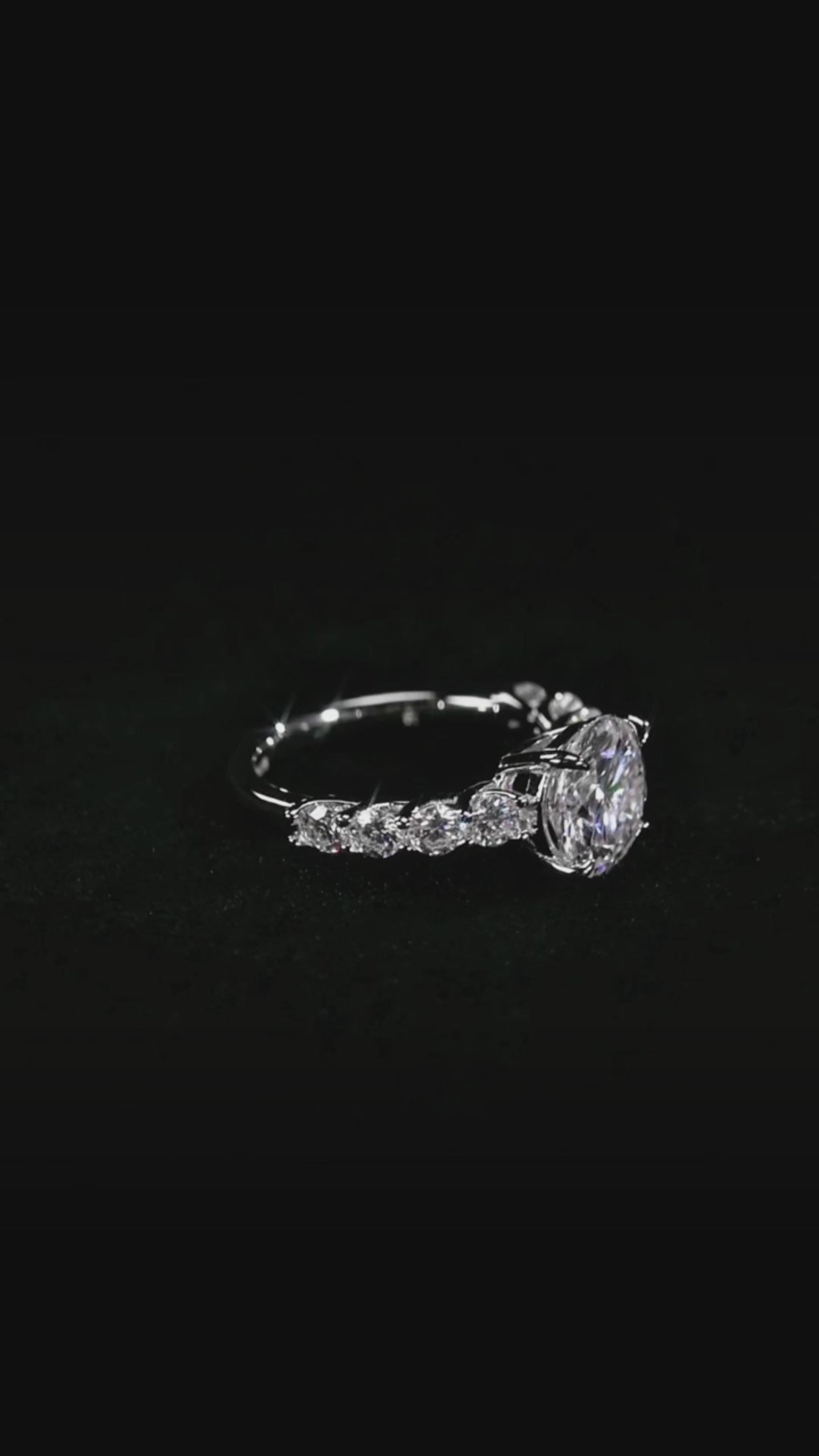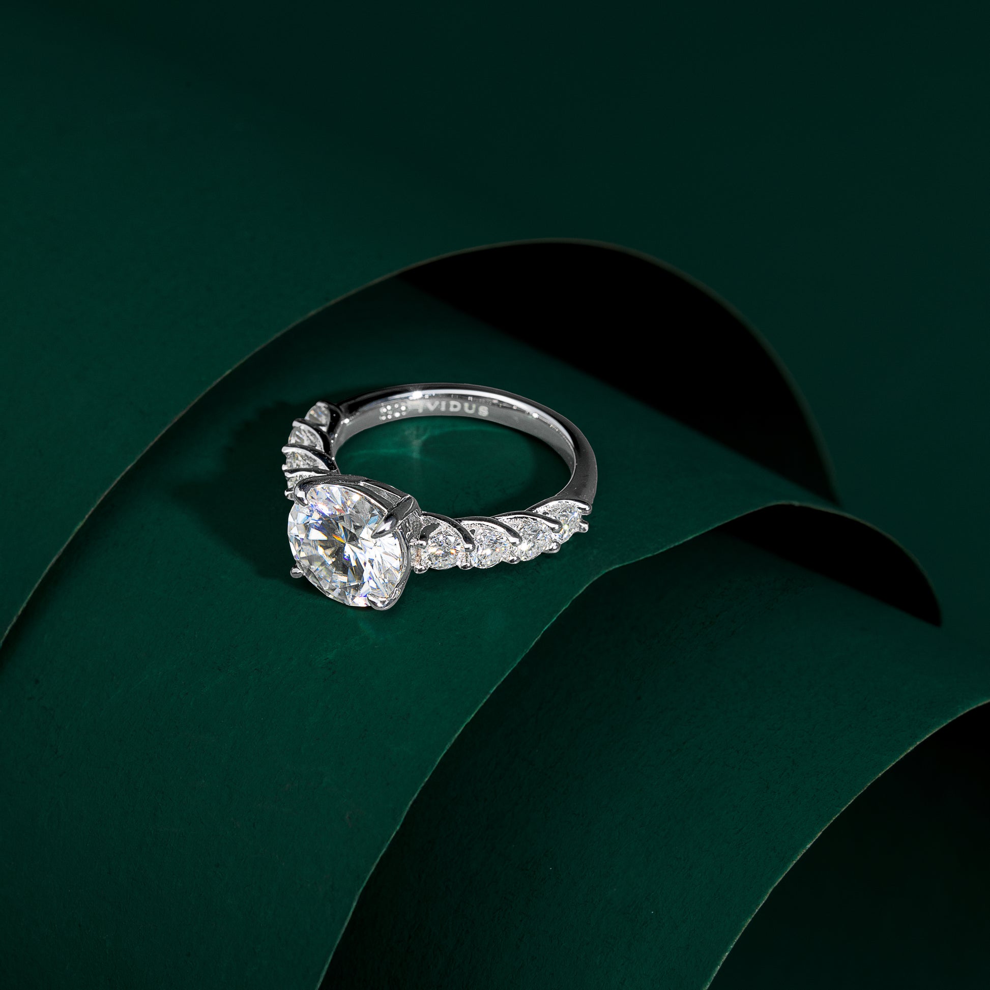 لم تكتمل الحكاية عند الحجر المركزي؛ فقد زيّنا إطار الخاتم بـ 8 أحجار مويسانيت إضافية، صُفت بعناية لتمتد كجسور من النور على طول الشريط، مما يضمن تألقاً متواصلاً من كافة الزوايا. صُنع الهيكل بحرفية عالية من الفضة الإسترلينية (925) المطلية بطبقة غنية من الذهب الأبيض عيار 18 قيراطاً، ليمنحكِ ذلك الملمس الناعم واللمعان البلاتيني الذي يليق بأهم لحظات حياتك.