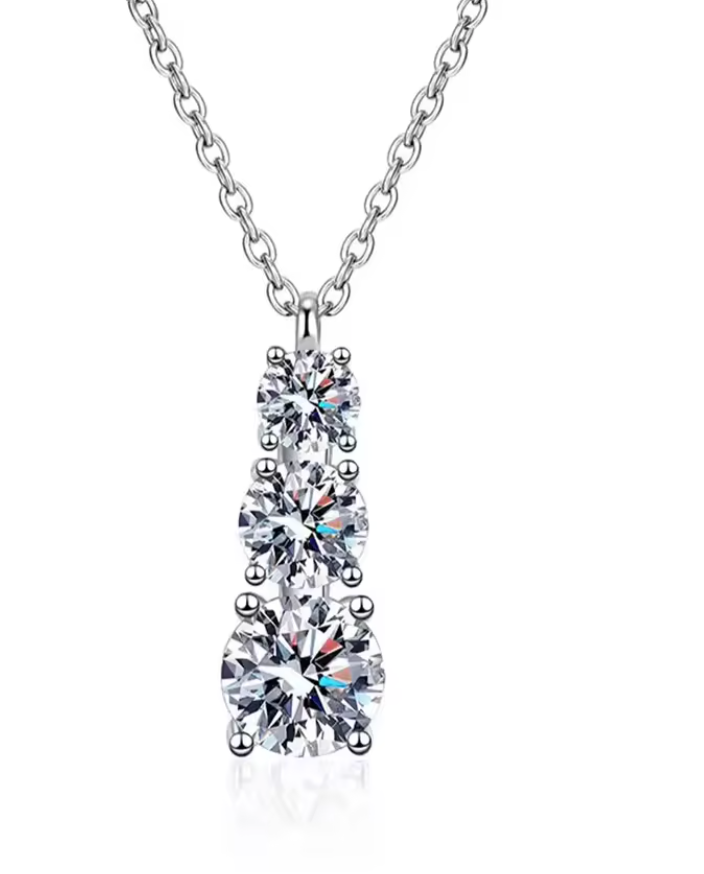 قلادة مويسانيتي ثلاثية الأحجار بقطع دائري تشعّ أناقةً وتألقًا راقيًا. تتميز هذه القلادة برصيعة عمودية من أحجار مويسانيتي دائرية يبلغ وزنها الإجمالي 1.8 قيراط - مع حجر 0.3 قيراط في الأعلى، وحجر 0.5 قيراط في المنتصف، وحجر 1 قيراط في القاعدة - مما يخلق تأثيرًا متدفقًا أنيقًا يلتقط الضوء بجمال من كل زاوية. صُنعت هذه القلادة بمهارة من الفضة الإسترلينية عيار 925، ومطلية بالروديوم الفاخر والذهب الأبيض عيار 18 قيراطًا، وتتميز بمتانة تدوم طويلًا، ولمعانًا مصقولًا فاخرًا، وأناقة خالدة - قطعة مثالية للمناسبات الخاصة أو للارتقاء بأناقتك اليومية.