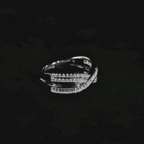 This Moissanite Band Ring features a crossover design featuring round and emerald-cut stones layered gracefully across the band, creating a dazzling play of light from every angle. Expertly crafted in 925 sterling silver with rhodium and 18K white gold plating, it combines lasting brilliance, refined elegance, and exceptional craftsmanship — a perfect moissanite band for everyday sophistication or a memorable gift.