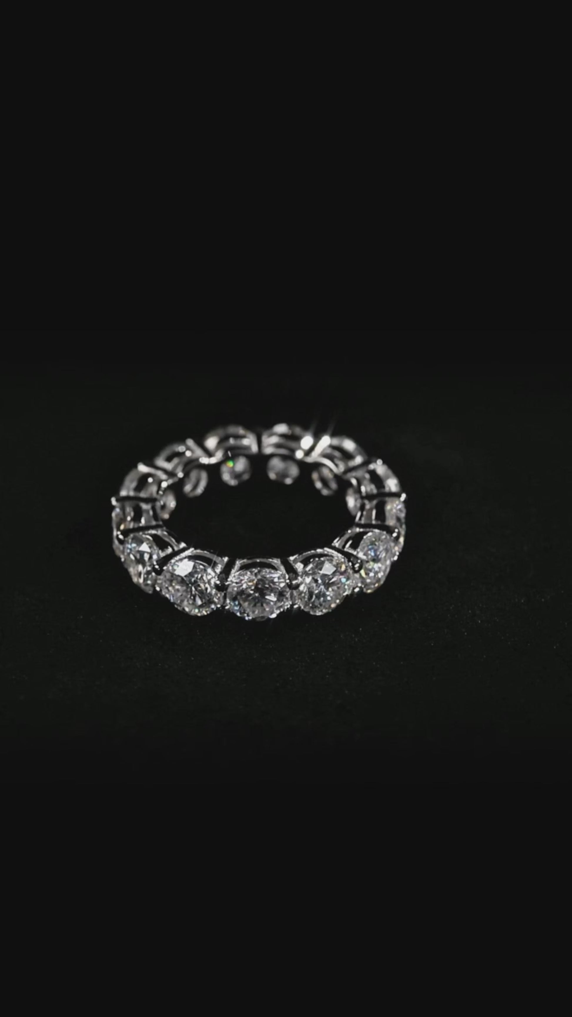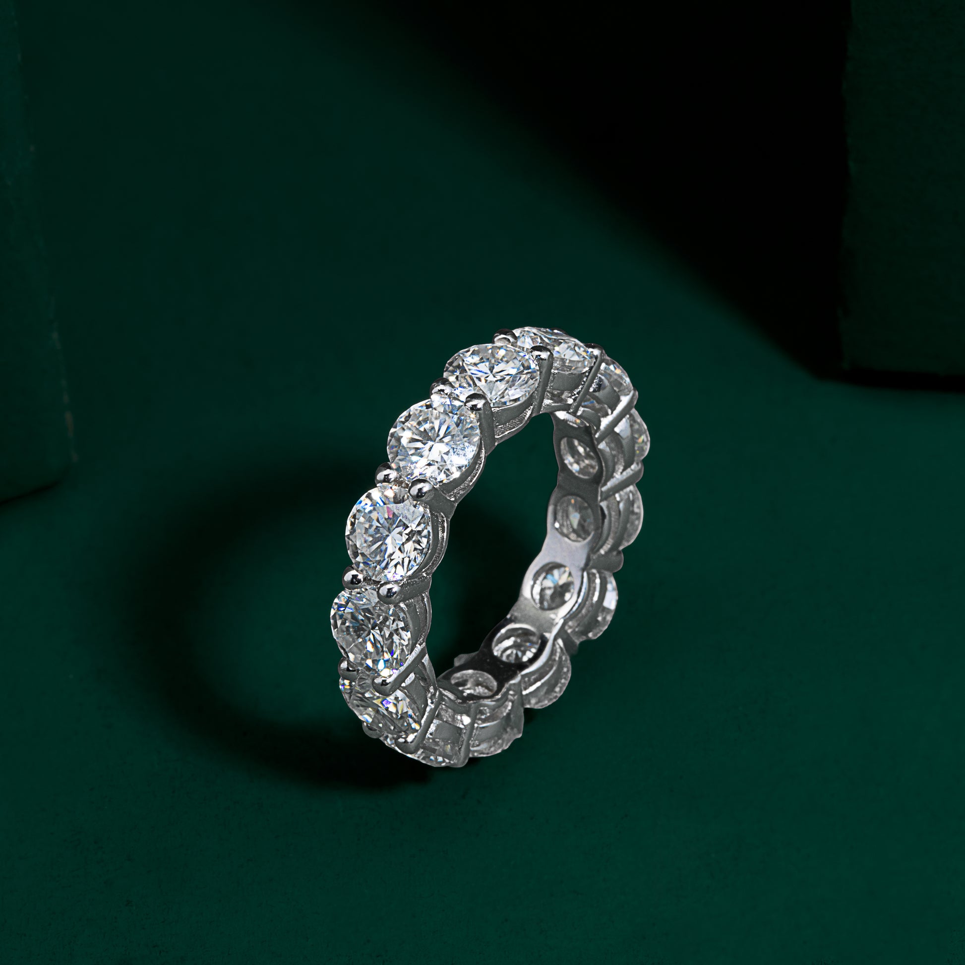 This Grand Eternity Moissanite Ring showcases continuous brilliance through its row of 0.5-carat round brilliant-cut stones, each symbolizing endless love and unbroken connection. Set in a flowing infinity-inspired design, every stone is positioned to maximize sparkle, creating a seamless loop of fire and radiance around the finger. Crafted in 925 sterling silver and finished with premium rhodium and 18K white gold plating, this ring offers lasting durability, a luminous high-end shine, and timeless significance — a striking statement piece or meaningful gift.