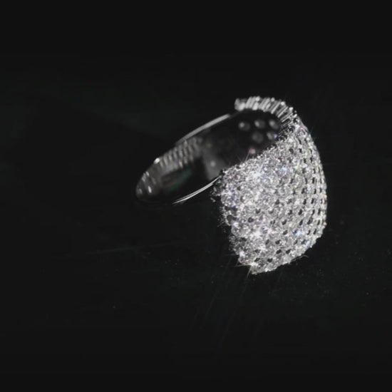 This Grand Pavé Moissanite Ring radiates luxury and grandeur. Featuring seven rows of 0.03ct moissanites across a wide, dramatic band, it delivers breathtaking brilliance and luxurious presence. Expertly crafted in 925 sterling silver and finished with rhodium and 18K white gold plating, this ring combines lasting shine, superior craftsmanship, and bold elegance — a perfect moissanite ring for special occasions.