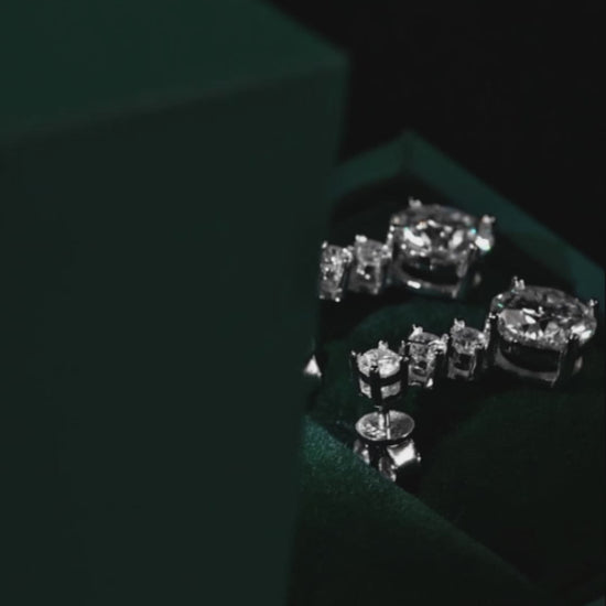 These Stacked Moissanite Drop Earrings radiate elegance and striking brilliance. Featuring a cascading design, each earring showcases three 0.1-carat moissanite stones leading to a stunning 2-carat round brilliant-cut moissanite at the base, creating a graceful vertical row that catches the light from every angle. Expertly crafted in 925 sterling silver and finished with premium rhodium, these earrings offer lasting durability - a perfect choice for special occasions.