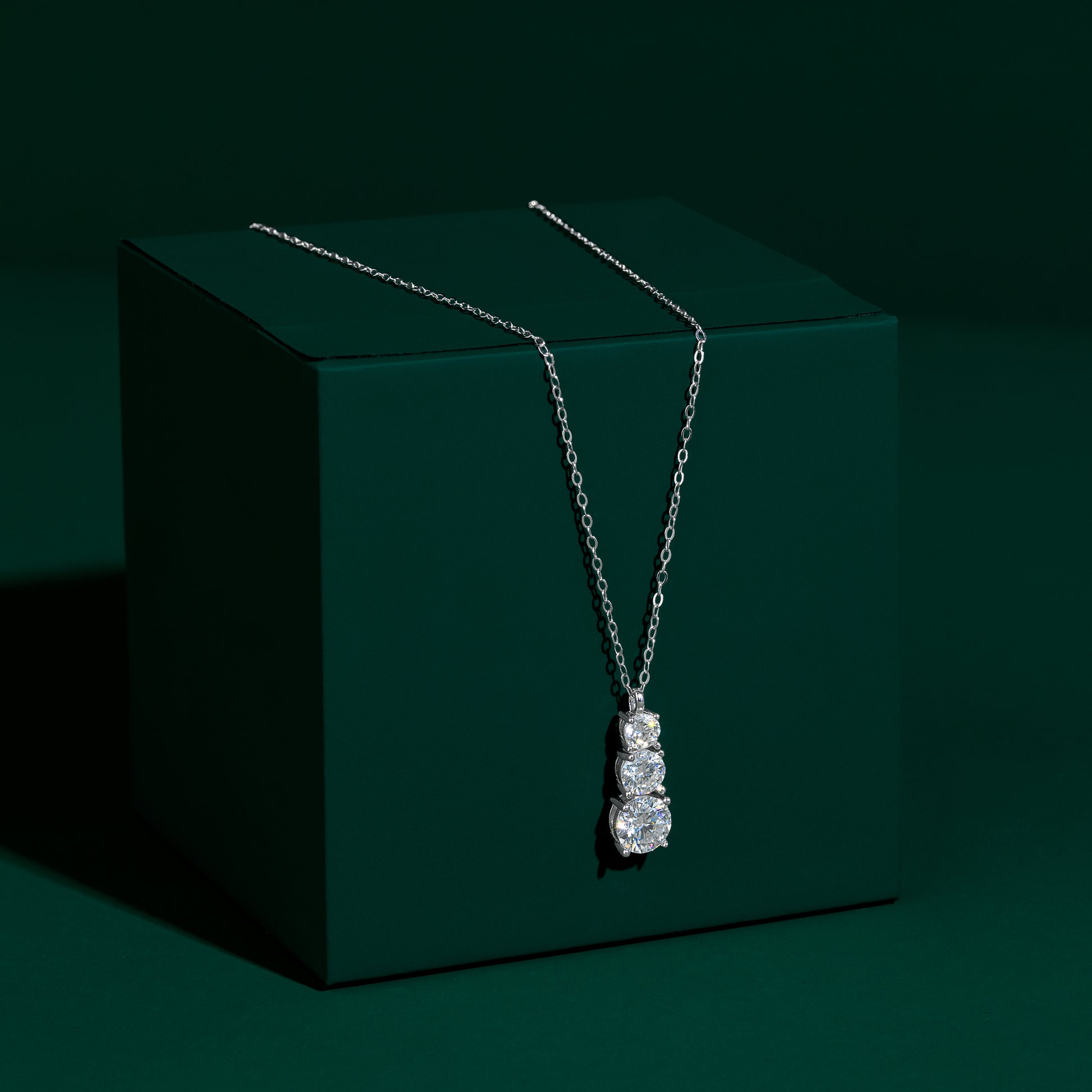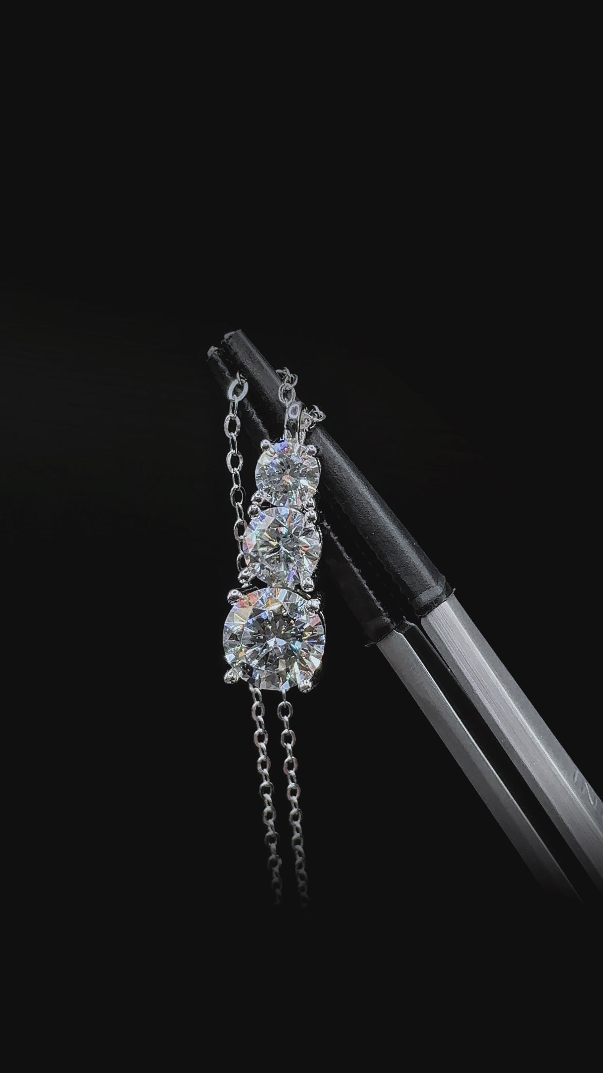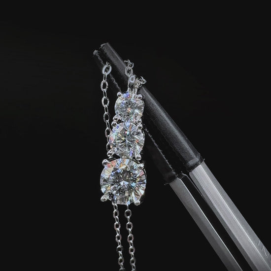 This Three-Stone Round Cut Moissanite Necklace radiates elegance and refined brilliance. Featuring a vertical stack of round-cut moissanites totaling 1.8 carats — with a 0.3ct stone at the top, a 0.5ct stone in the center, and a 1ct stone at the base — the pendant creates a graceful cascading effect that captures light beautifully from every angle. Expertly crafted in 925 sterling silver and finished with premium rhodium and 18K white gold plating, this necklace delivers lasting durability, polished high-end shine, and timeless sophistication — a perfect statement piece for special occasions or elevating everyday elegance.