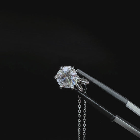 This 2-Carat Round Brilliant-Cut Moissanite Solitaire Pendant Necklace radiates timeless elegance and captivating brilliance. Featuring a single 2-carat round brilliant-cut moissanite in 6 prong setting, the pendant showcases the stone’s fire and clarity from every angle. Expertly crafted in 925 sterling silver and finished with premium rhodium, this moissanite pendant necklace delivers lasting durability, a polished high-end finish, and enduring shine — a perfect gift or statement piece.